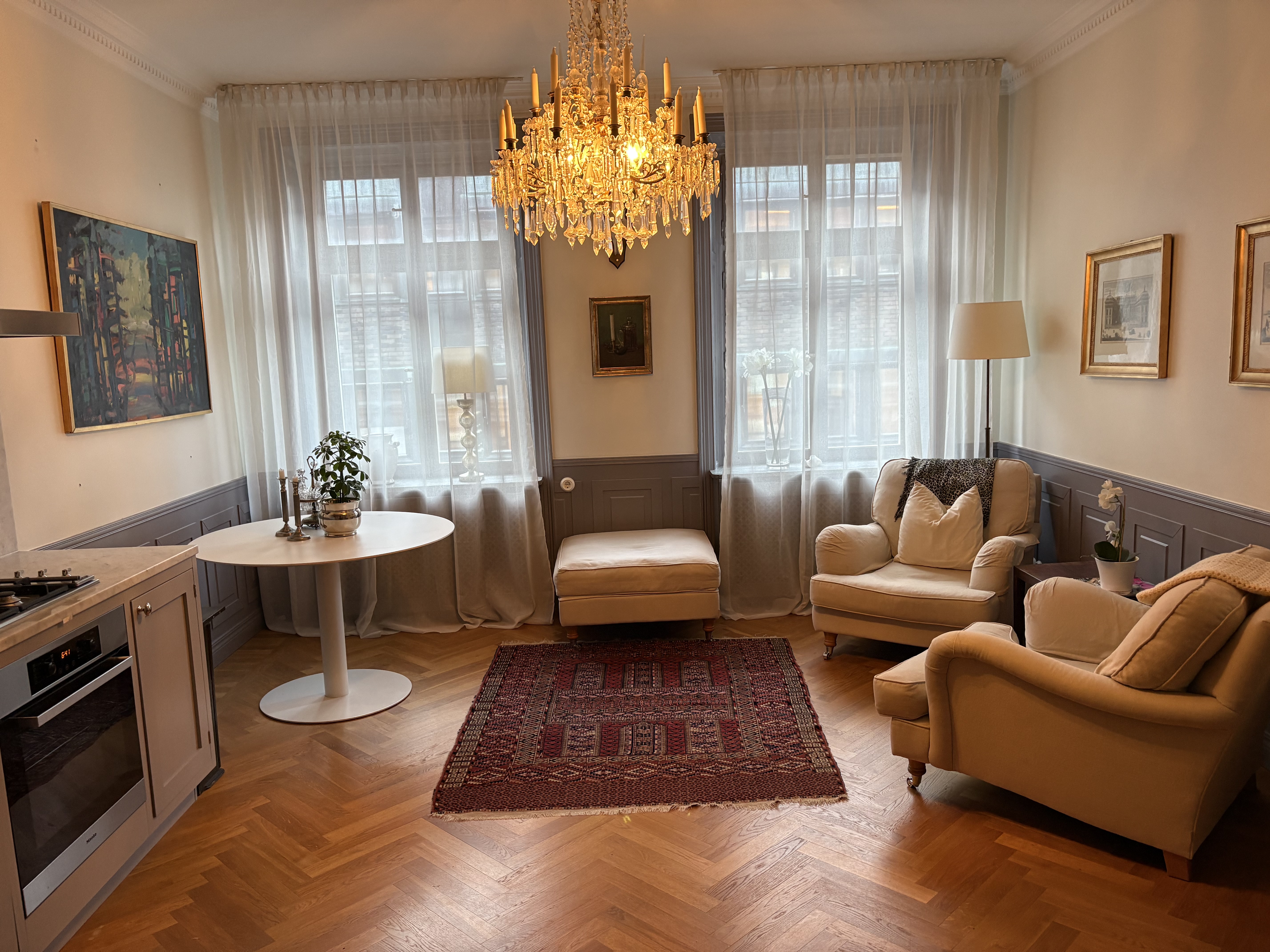 Två rum, varav ett sovrum och ett allrum med integrerat kök. Liten hall med en klädkammare för bl a ytterplagg och skor. Ytterligare en större klädkammare mellan sovrum och bad. Inbyggda garderobsluckor i sovrummet. Badrum med dusch och tvätt-/torkmaskin. Totalt 44 välplanerade kvadratmeter. Mycket lugn brf så hyresgäst förväntas respektera detta. Lummig innergård. Gediget renoverat för ca 10 år sedan med kvalitetsmaterial och maskiner. Stilfullt inredd. Hyr ut på grund av förändrad lokalisering av arbetsplats.